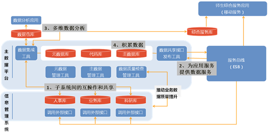 高校經(jīng)過(guò)多年的信息化建設,已經(jīng)形成了一套校內的信息標準,并且學(xué)?,F在已經(jīng)建立了公共數據平臺,用于處理各業(yè)務(wù)系統的共享數據交換和集成,同時(shí)積累大量的業(yè)務(wù)數據。但隨著(zhù)信息技術(shù)的發(fā)展和校內業(yè)務(wù)的調整,原有信息標準已經(jīng)不能滿(mǎn)足未來(lái)的信息化發(fā)展需要,現有的公共數據平臺也無(wú)法支撐后期開(kāi)放架構下的數據共享與管理,校內數據質(zhì)量也存在一定問(wèn)題。因此,為了達成上文信息化生態(tài)的整體建設目標,建議對現有的公共數據平臺進(jìn)行升級改造,從以下幾個(gè)層面提升數據平臺的能力: