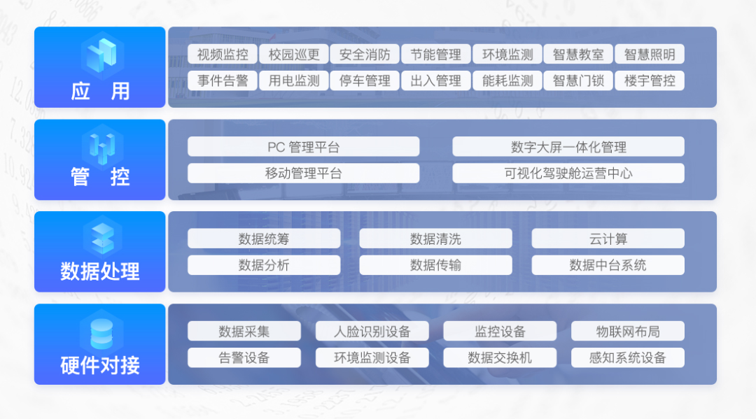 整個(gè)智慧校園處理方案涵蓋學(xué)生、教師、校園三端,賦能科研立異、學(xué)習效率、教育質(zhì)量、運營(yíng)辦理等個(gè)性化運用場(chǎng)景。從技能視點(diǎn),以“智慧校園=智慧校園頂層規劃+數字孿生智能運營(yíng)中心+1個(gè)數據中臺+運用軟件層+校園智能硬件及體系對接”的體系化結構,重構智慧校園的辦理形式,為智慧校園開(kāi)展注入新動(dòng)能。