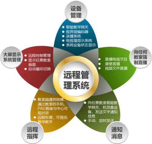 遠程管理系統:遠程管理系統軟件+管理計算機組成,可建設教學(xué)綜合管理中心,實(shí)現大屏幕顯示所有教室的設備狀態(tài)、教室畫(huà)面。教室端設備故障時(shí),通過(guò)互動(dòng)教學(xué)系統實(shí)現,遠程指導的功能。錄播教室、智慧教室等多系統,統一平臺集中控制管理。